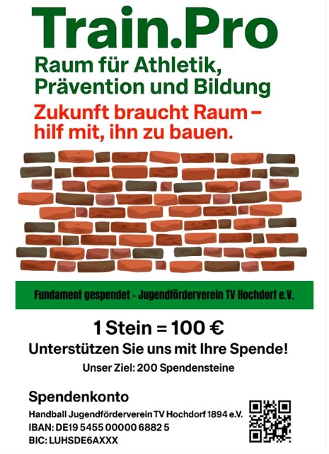 Der Eulen-Club 100 unterstützt den vom Handballjugendförderverein des TV Hochdorf geplanten Neubau eines circa 100 Quadratmeter großen Athletik- und Präventionsraums in Hochdorf mit 1.000 Euro. Durch den Bau soll tägliches Training für Kinder- und Jugendmannschaften sowie gesundheitsorientierte Angebote wie Reha- und Präventionssport ermöglicht werden. Das Projekt soll im Frühjahr 2027 abgeschlossen sein. An Eigenmiteln bringt der von Stefan Deffert geführte Handballjugendförderverein 35.000 Euro ein, der Wert der geplanten Eigenleistungen wird mit 66.500 Euro beziffert. Offen ist noch ein Betrag von 73.500 Euro, der möglichst durch Spenden abgedeckt werden soll. Dafür werden symbolisch Bausteine im Wert von 100 Euro verkauft. Der Eulen-Club 100 hat zehn Bausteine im Gesamtwert von 1.000 Euro gekauft.