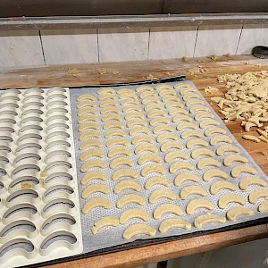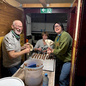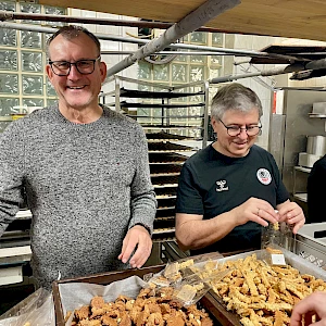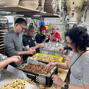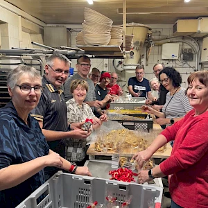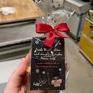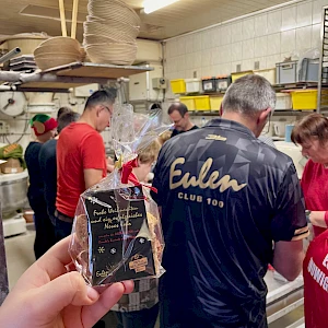 Süße Überraschung nach dem EULEN-Spiel gegen HSG Nordhorn-Lingen einen Tag vor Heiligabend: Der Eulen-Club 100 hat in Kooperation mit der Bäckerei Brendel Weihnachtsgebäcktütchen an den Ausgängen der Friedrich-Ebert-Halle an die Zuschauer verteilt. 14 Mitglieder des Eulen-Clubs 100 hatten am Samstag 10.000 Weihnachtsplätzchen in der Backstube von Bäcker Brendel am Goerdelerplatz im Hemshof gebacken und die köstlichen Ergebnisse am Sonntag in über 2.000 Tütchen verpackt. Die Bäckerei Jochen Brendel hat das Equipment und alle Zutaten kostenfrei zur Verfügung gestellt, sodass der Eulen-Club 100 diese Aktion für alle Fans ohne eigene Kosten durchführen konnte! „Eine großartige Aktion von Jochen Brendel – Danke“, sagt der Eulen-Club 100.