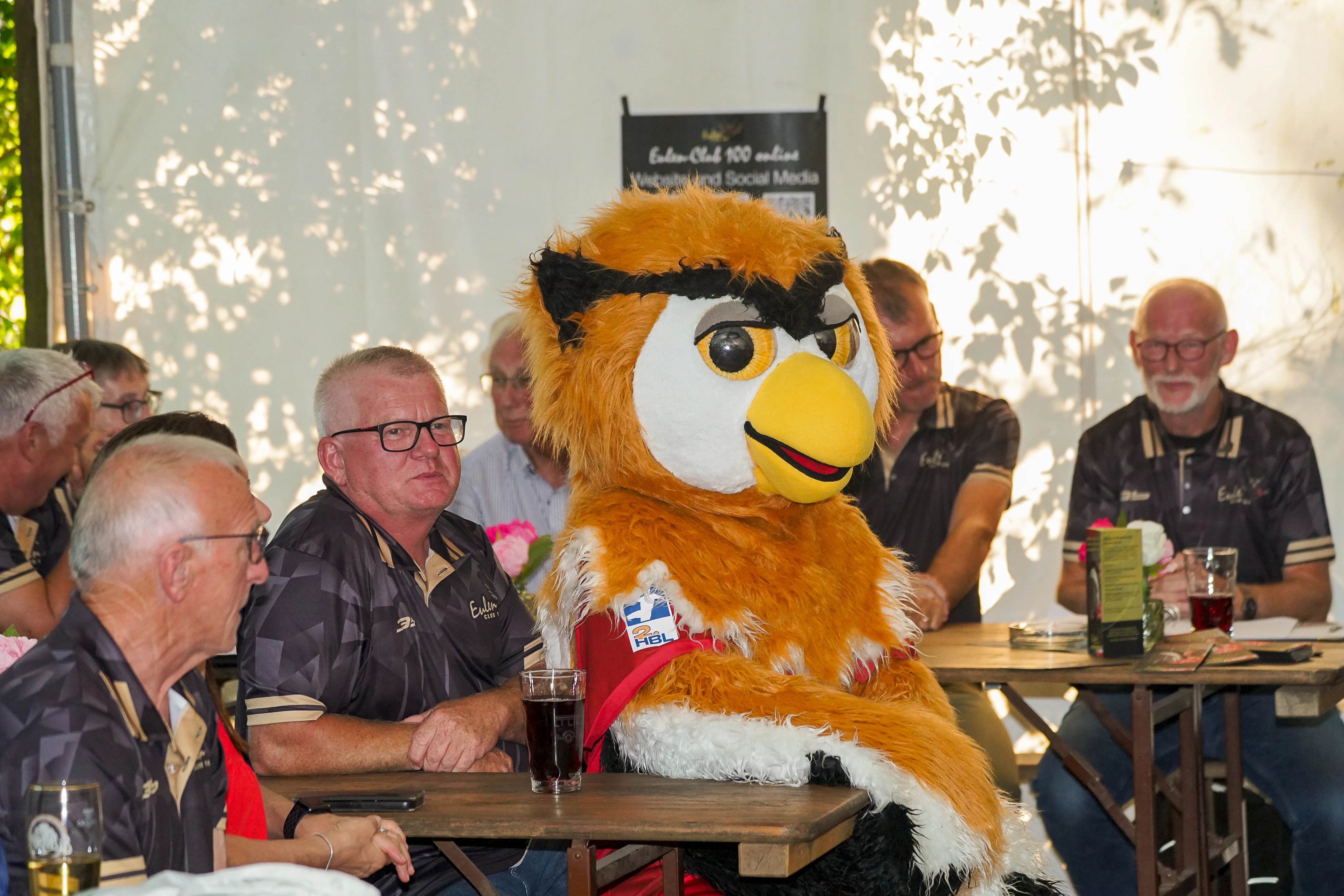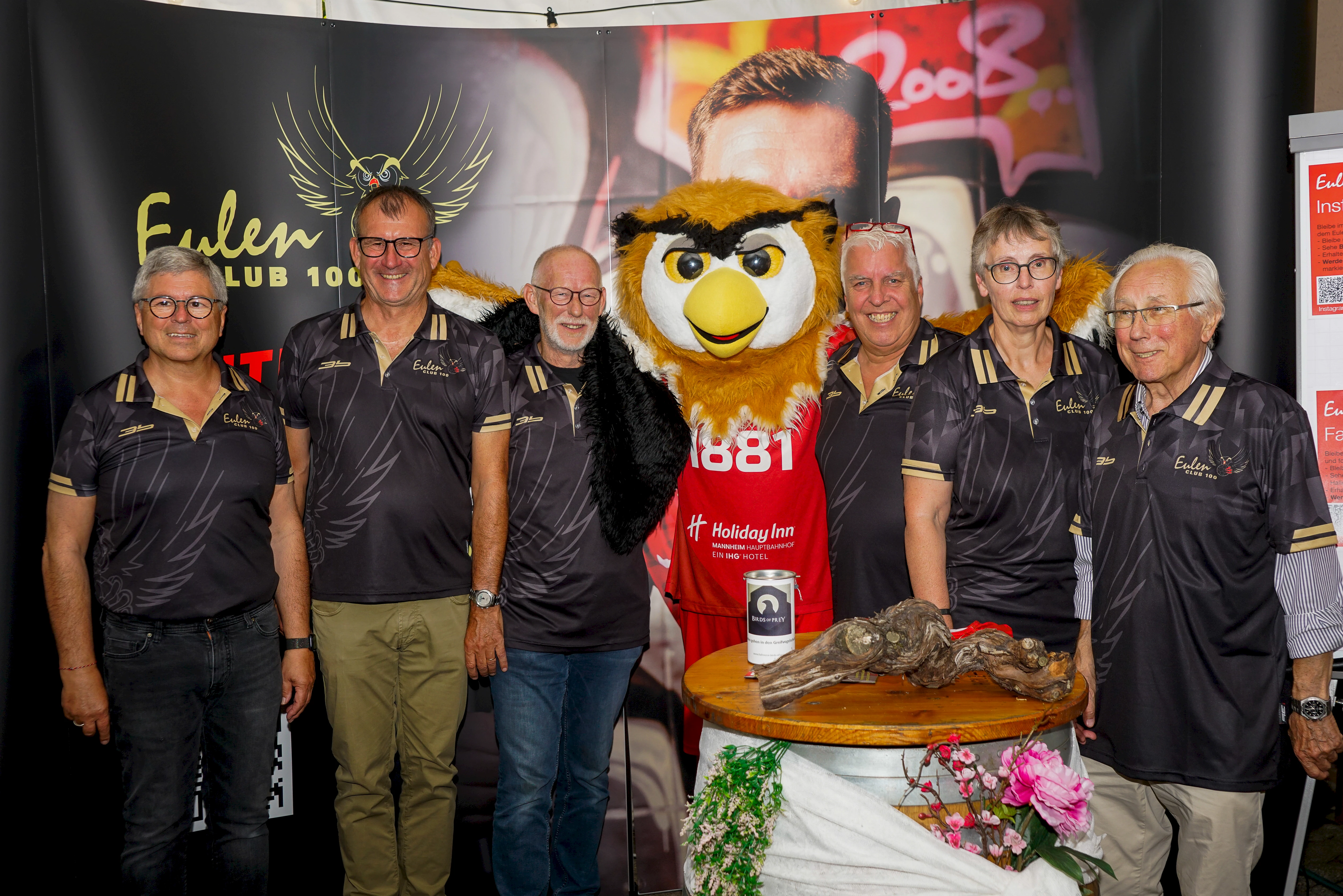Bei der Mitgliederversammlung im Behler Haisl durfte auch Tim, die Eule, nicht fehlen. Das neue Trikot des Maskottchens hat der Eulen-Club 100 gesponsort. Der hat jetzt 106 Mitglieder. Im vergangenen Jahr gab es im Zuge der Eulen-Krise diverse Austritte, aber auch 16 Neuzugänge, bilanziert Dieter Mayer. Gut angenommen werden Partner-Mitgliedschaften. 2019, sagte Vize Uwe Hocke, hatte der Eulen-Club 100 exakt 48 Mitglieder und ein Beitragsvolumen von 17.000 Euro. 2025 bringen 106 Mitglieder 42.120 Euro in die Club-Kasse. Hocke: „Das ist ein Mitgliederzuwachs von 86 Prozent und ein Einnahmeplus von 59 Prozent.“