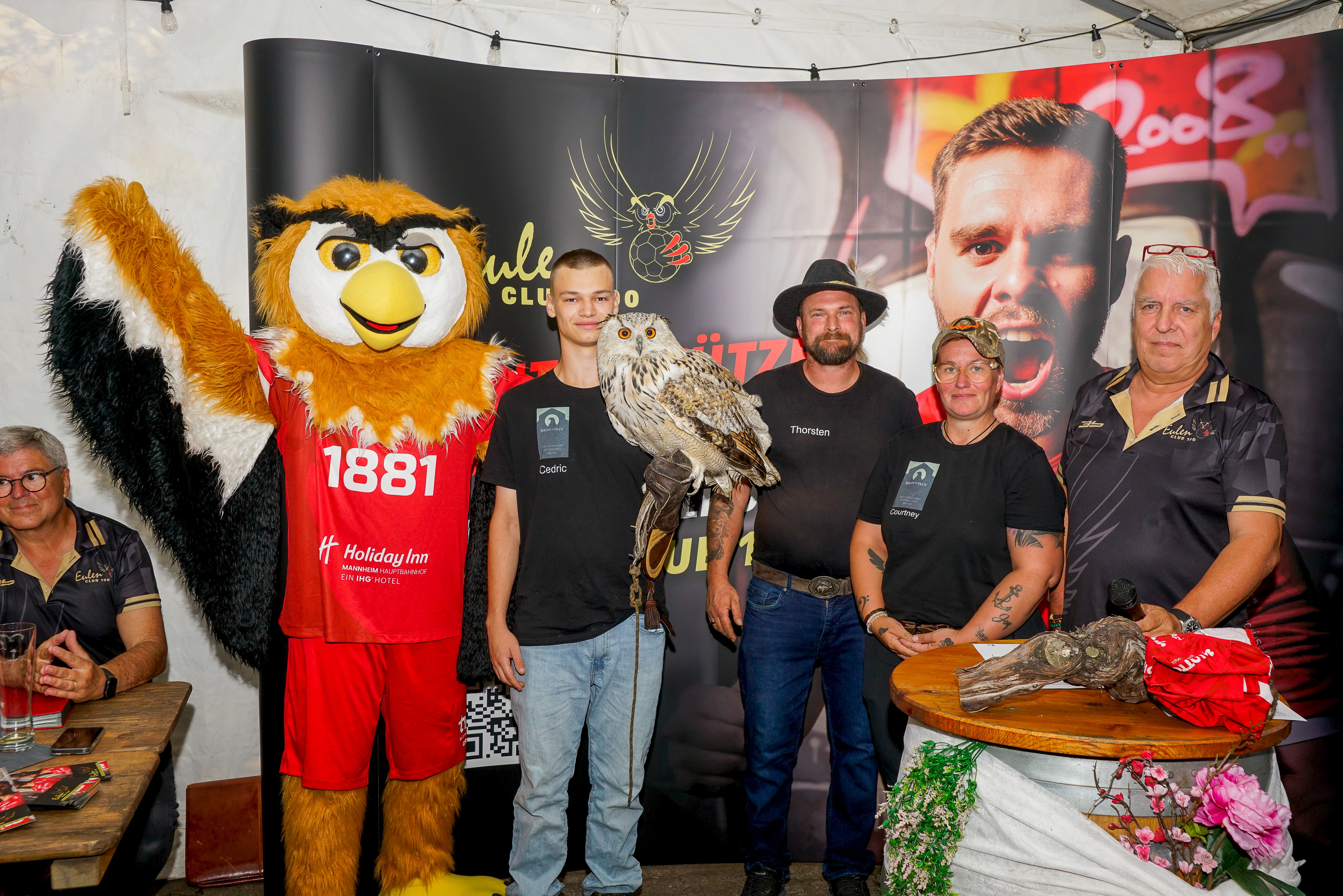 Das wird auch von herzlicher Spontaneität beeinflusst, wie das Zusammenspiel mit der Falknerei "Birds of Prey" aus Speyer zeigt. Das von Courtney Iwersen geführte Unternehmen war beim Foto-Shooting der Eulen-Profis mit den „richtigen“ Eulen am 17. Juli dabei. Eine tolle Idee – Marketing mit Herz. Nun aber hat die 2021 in Waldsee gegründete Falknerei, die seit letztem Jahr in Speyer im Spitzenrheinhof daheim ist, ein Problem: Thorsten Iwersen, der Ehemann der Inhaberin, erlitt einen Trümmerbruch des rechten Arms. Er ist vor allem für die großen Greifvögel zuständig. Seinen Ausfall können Sohn Cedric und Daniel Kolosziewski, die treue Helferseele, alleine nicht auffangen, Einnahmen gehen verloren. Und da kommt der Eulen-Club 100 ins Spiel. „Wir übernehmen die Patenschaft für Emma, einen sibirischen Uhu. Emma ist auch das neue Wappentier des Eulen-Clubs 100“, erläuterte Christian Hasert. Der Blick ins Lexikon erklärt: Der Uhu ist die größte Eulen-Art der Welt. Courtney Iwersen ist glücklich über die unverhoffte Unterstützung der Eulen, auch über das Bare in den spontan aufgestellten Sammelbüchsen. „Danke für die Übernahme der Patenschaft. Ich kann einfach nur Danke sagen“, erklärte sie als Gast der Mitgliederversammlung. Und am 14. September, wenn die Eulen beim Heimspiel gegen Großwallstadt Familientag feiern, ist auch Emma live am Start. Eine Eule als Glückbringer für die Eulen …