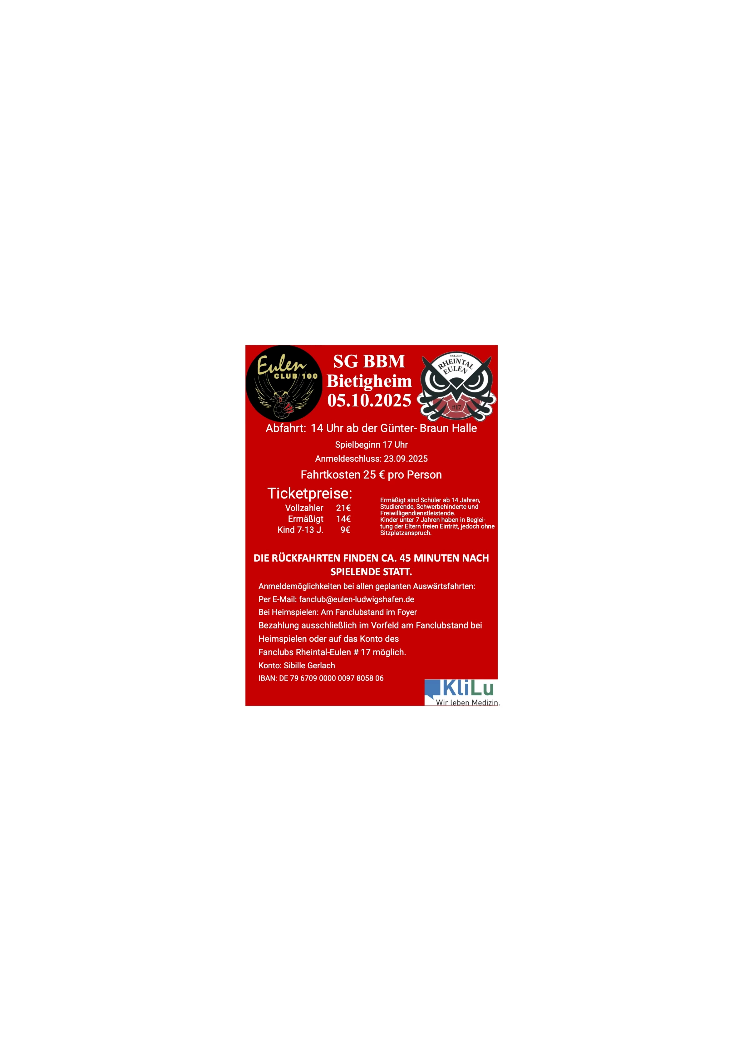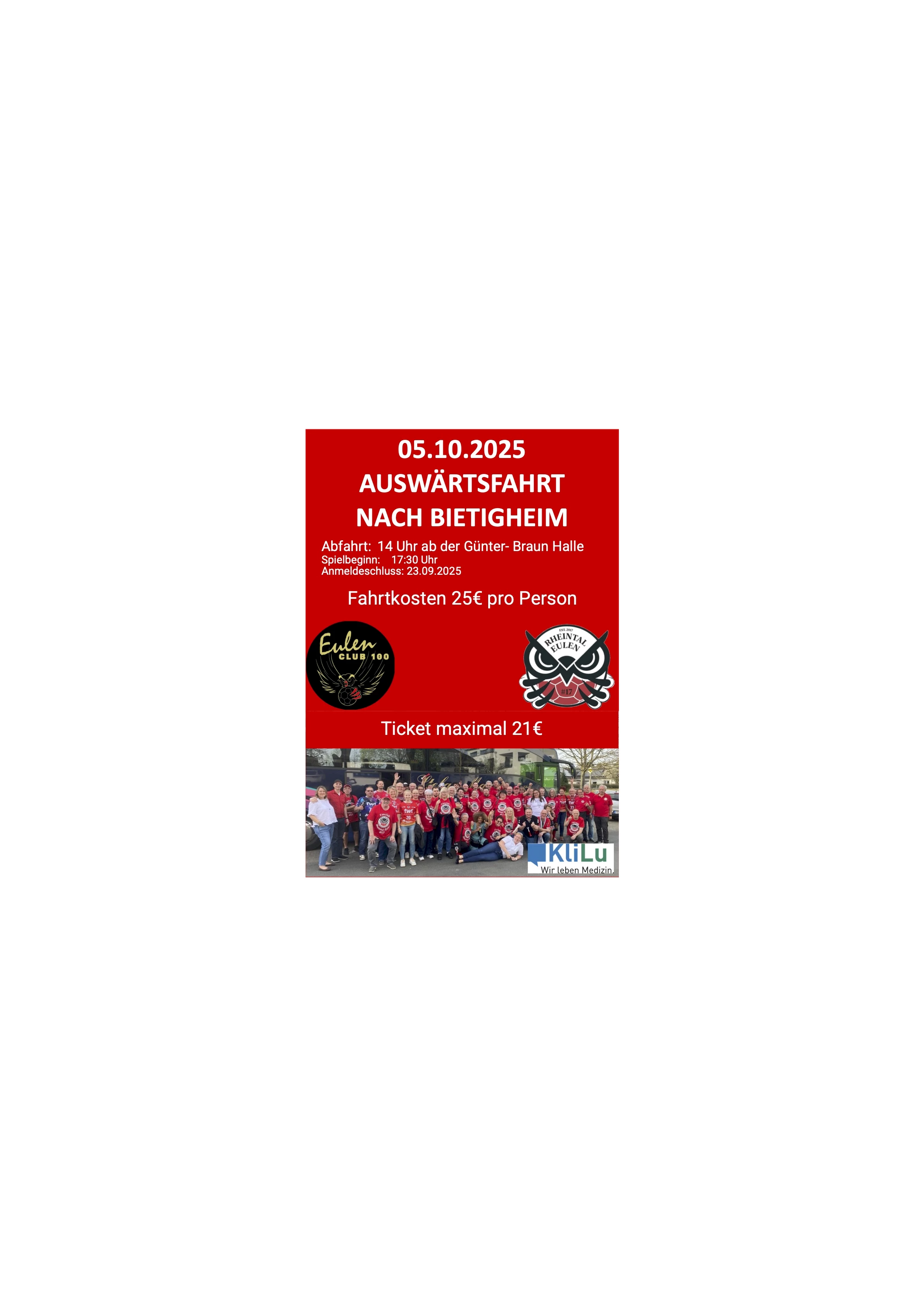 Der Fanclub Rheintal-Eulen #17 organisiert am Sonntag, 5. Oktober, eine Fahrt zum Spiel der Eulen beim Bundesliga-Absteiger SG BBM Bietigheim. Das finden wir vom Eulen-Club 100 gut und unterstützen die Fanreise. Das Spiel beginnt um 17 Uhr, der Bus startet um 14 Uhr an der Günter-Braun-Halle in Friesenheim. Anmeldemöglichkeiten bestehen beim Heimspiel gegen Dessau am Info-Stand der Rheintal-Eulen im Foyer der Friedrich-Ebert-Halle und per E-Mail unter fanclub@eulen-ludwigshafen.